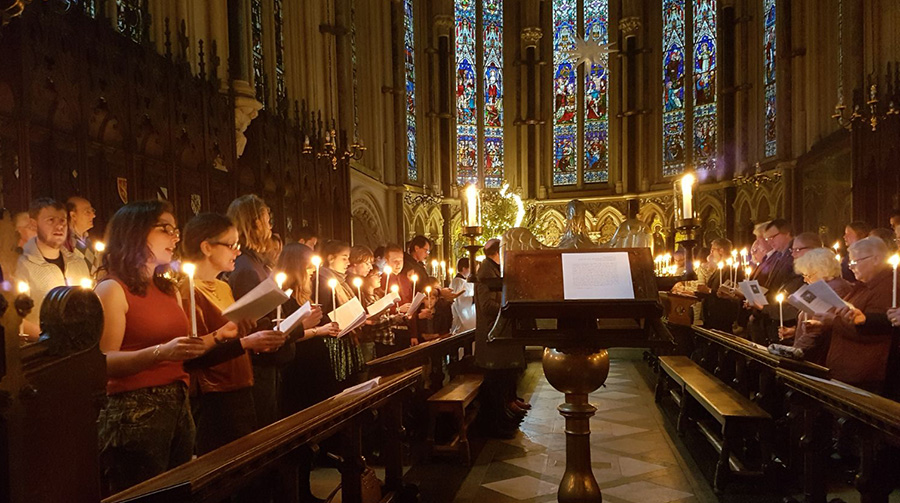 On Saturday 16 December alumni were welcomed to Exeter College Chapel for a special Christmas Carol service. The service was led by Exeter’s chaplain, the Rev’d Andrew Allen, and included readings from alumni Richard Jackson (1971, Jurisprudence) and Alice Bloom (2012, English). The carols included On Christmas night all Christians sing and A boy is born in Bethlehem, sung by Exeter’s choir, and the full congregation joining together to sing O come, all ye faithful, O little town of Bethlehem, While shepherds watched their flocks by night, In the bleak midwinter, and Hark! The herald angels sing.